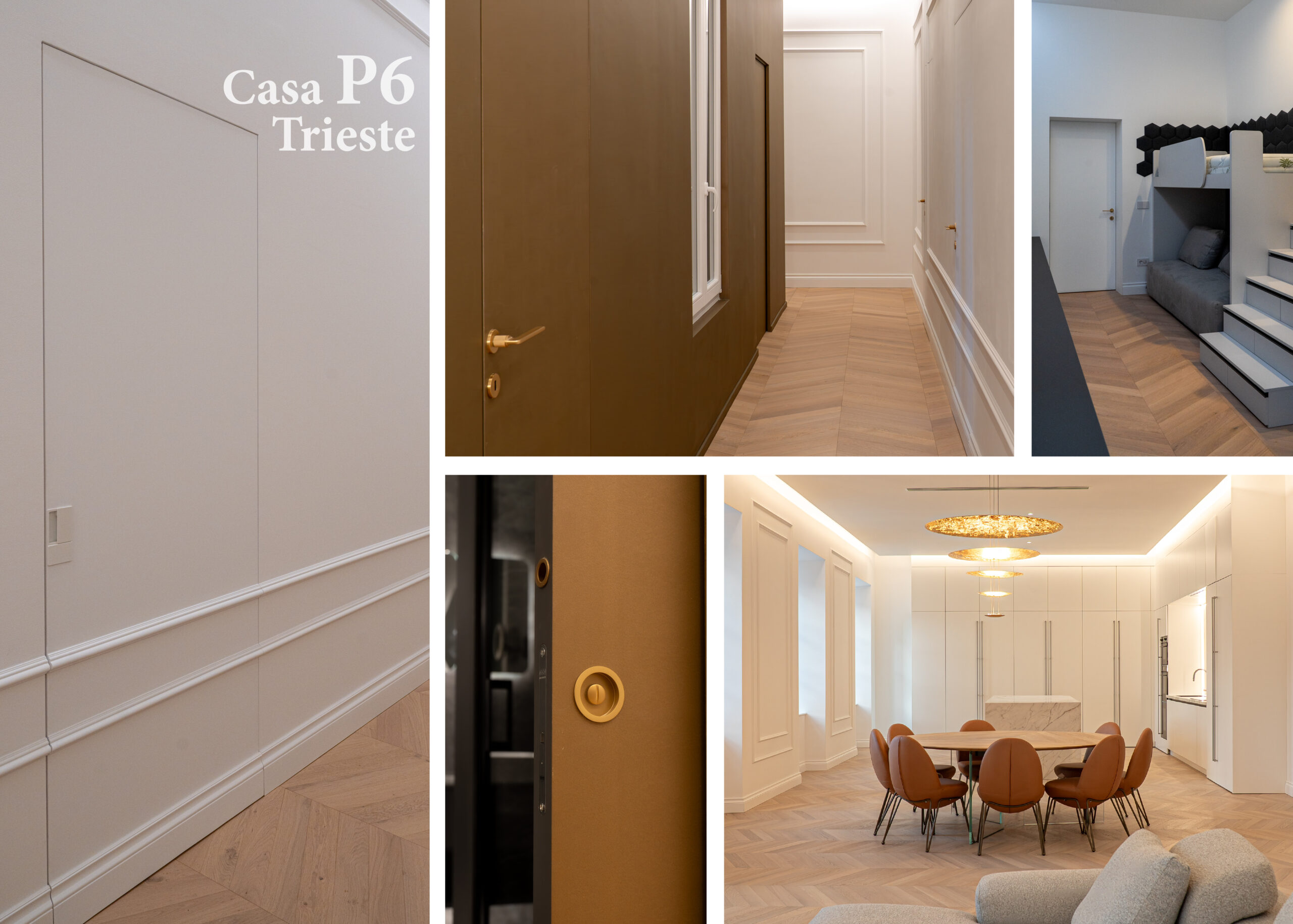 Passeggiando per i 300 mq di Casa P6 si incontra un catalogo di scelte di pregio: parquet in rovere a spina di pesce, marmo Calacatta Gold, dettagli in foglia d’oro, modanature e finiture sartoriali.