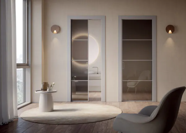 Il vetro lascia filtrare la luce, ampliando la percezione degli spazi, mentre le finiture laccate introducono un tocco naturale, accogliente ed elegante. Un’armonia di materiali che rende le porte vetrate scorrevoli a scomparsa o a battente Luce adatte sia ad ambienti residenziali contemporanei, sia a contesti professionali che desiderano coniugare luminosità e comfort. Puoi scegliere tra vetro trasparente per esaltare la chiarezza o vetro satinato per garantire maggiore privacy.